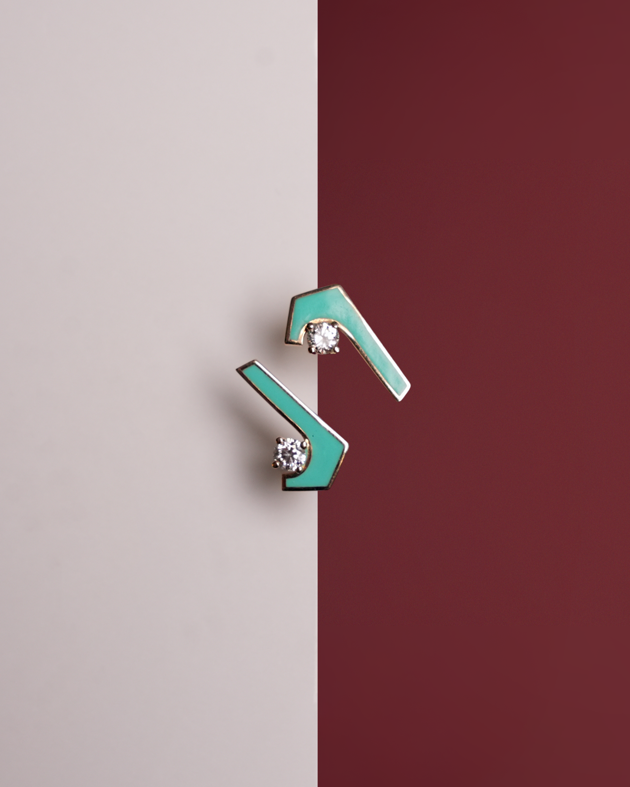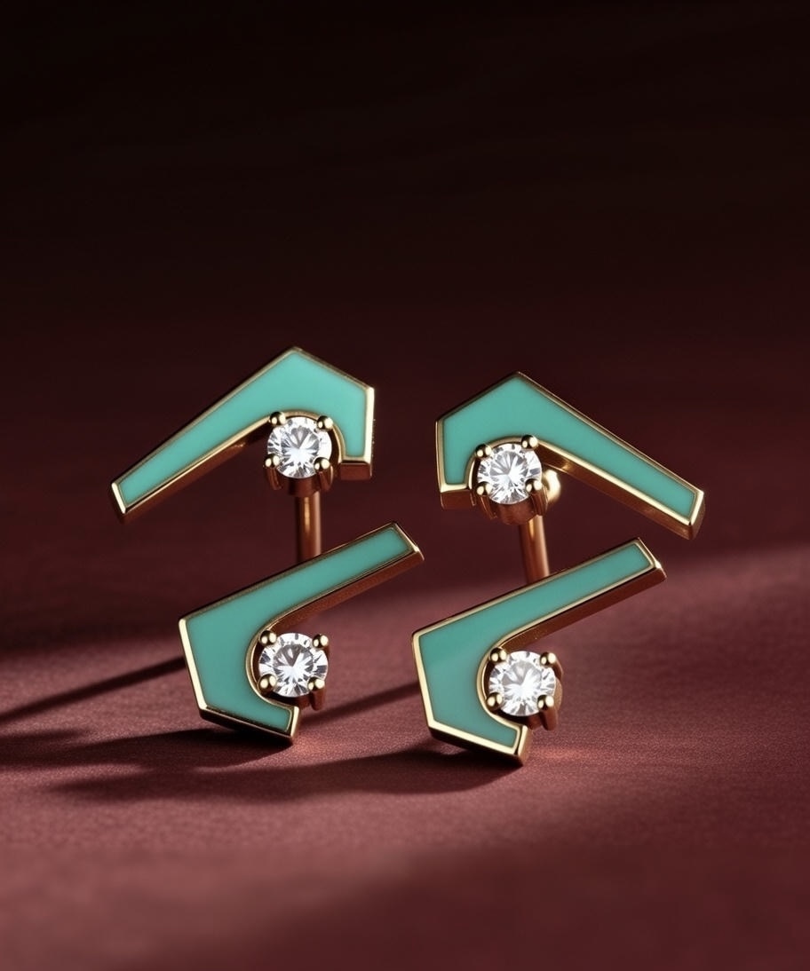 Mimari zarafet canlı renklerle buluşuyor. Bu küpeler, turkuaz emaye ve tek taş pırlantalarla süslenmiş benzersiz açılı bir tasarıma sahiptir. Günlük stilinize renk ve sofistikelik katmak için mükemmel.
